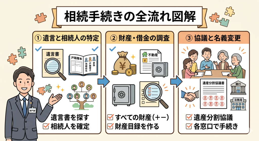 - 全体の流れ: 「遺言書の確認」→「相続人の調査(戸籍集め)」→「財産の調査」→「話し合い(遺産分割協議)」→「各所での名義変更」という順番で進めます。