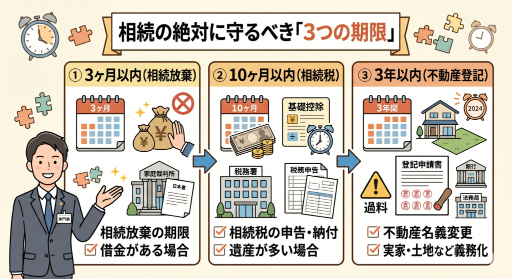 遺産が基礎控除額(3,000万円+600万円×相続人の数)を超える場合、税務署へ申告と納税が必要です。 - 3年以内(不動産の相続登記)